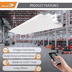 - Run Bison 4FT LED High Bay Shop Light with Motion Sensor (Remote Controller Included), 300W High Bay LED Light, 40500LM, 120-277V, 5000K Daylight Linear Hanging Light, UL&DLC Listed-4PK