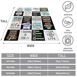 Programmer Gifts: The novelty programmer-themed printed blankets are warm gifts! They will be a thoughtful and meaningful gift that fully expresses your love and surprises people. Coding computer science gifts for men, are perfect for birthdays, Christmas, Father's Day, New Year, Valentine's Day, or other festivals. These blankets will become an essential part of your daily life. High-quality fabric: Our throw blanket is made of 100% high-quality flannel, which is very soft and comfortable, fuzzy, skin-friendly, plush, and fluffy, with no pilling, and no shedding. With it, you'll experience uninterrupted comfort in all seasons. Size: Three sizes: 40x50 inches, children/pet blanket. 50x60 inches, perfect for teenage boys/girls. 60x80 inches, suitable for adults. It has enough weight to keep you comfortable without making you sweat. Multi-purpose: The flannel blanket can be used in all seasons, whether in the cold winter or the air-conditioned room in the summer. It is very suitable for use as a bed blanket, sofa blanket, nap blanket, lap blanket, shawl blanket, room decoration, etc. It's lightweight and portable making it a great item for camping or traveling. You can also use it as a pet mat for cats and dogs. Easy Care: Caring for this blanket is very simple. Machine washable and tumble dry on low to ensure it stays soft and fresh. If you have any questions about the blanket, feel free to contact us.