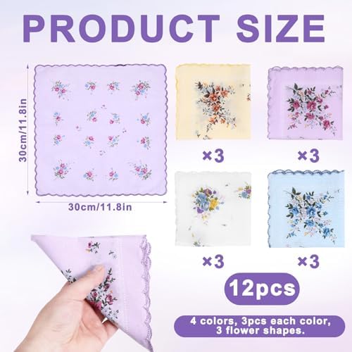 12Pcs Handkerchiefs for Women Vintage Ladies Handkerchiefs, 11'' Floral Handkerchief for Women with Wavy Edge Handkerchiefs for Women Embroidered Ladies Handkerchief Tea Party Favors