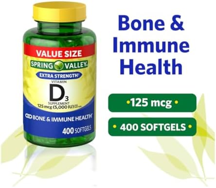 Spring Valley Vitamin D3 Softgels, 125 mcg (5000 IU), 400 Count One 400 count bottle of Spring Valley 5,000 IU Vitamin D3 Softgels Vitamin D3 supplements include a potent and active form of Vitamin D Vitamin D3 supplement contributes to proper calcium absorption and supports healthy bones and teeth * This reliable source of Vitamin D3 is a great option for those in search of a daily immune support supplement * Non-GMO, gluten free, and dairy free Vitamin D supplement Adults should take one Vitamin D 5,000 IU softgel daily, preferably with a meal United States Mint