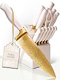 - "Effortless Cutting Meets Luxury – White & Gold Knife Set with Built-In Sharpener Upgrade your kitchen with a white and gold knife set with block that’s as functional as it is stylish! This 14-piece gold kitchen knife set features high-carbon stainless steel blades with a gold titanium coating, ensuring long-lasting sharpness, rust resistance, and effortless slicing. The built-in sharpener keeps your knives in peak condition, so you’ll never have to deal with dull blades again. Designed for comfort, each knife in this gold knife set with block features an ergonomic, well-balanced handle for fatigue-free cutting. Whether you’re prepping for a feast or tackling tough meats and vegetables, the razor-sharp blades make every cut smooth and precise. Plus, the stain-resistant white handles stay pristine over time, complementing your gold kitchen accessories beautifully. This kitchen knives set with block includes every essential knife: chef’s knife, carving knife, santoku, bread knife, utility knife, paring knife, six white and gold steak knives, and heavy-duty kitchen shears—all housed in a durable knife block with a built-in sharpener for easy storage. Easy Maintenance & Care: While this set is built for durability, we recommend hand washing to preserve the sharpness and gold finish. Not dishwasher safe. Why You’ll Love It: ✔ Effortless Sharpness – Built-in sharpener keeps blades razor-sharp. ✔ Rust & Tarnish Resistant – Gold titanium coating prevents corrosion. ✔ Ergonomic & Comfortable – Balanced handles for fatigue-free use. ✔ Heavy-Duty Performance – Cuts through tough meats and veggies with ease. ✔ Perfect Gift – A stunning addition to any modern kitchen. Upgrade your kitchen with this gold and white knife set!"