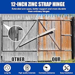 - Features: With their simple yet efficient design, these strap hinges can be easily attached to your gates, doors or sheds, opting for a straightforward installation process Thanks to their robust galvanized steel construction, these strap hinges require minimal maintenance, proving their suitability for years of regular use, both for residential and commercial applications Specifications: Material: galvanized steel Color: silver Size: 12 inches Package includes: 4 x Strap hinges Notes: Manual measurement, please allow slight errors on size. The color may exist a slight difference due to different screen displays.