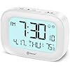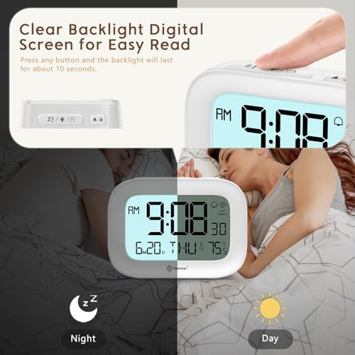 - SILENT OPERATION FOR A PEACEFUL NIGHT – Enjoy restful, uninterrupted sleep with this quiet digital alarm clock — no ticking sounds to keep you awake. The screen stays off in the dark for a distraction-free environment, and when needed, a soft blue LED backlight gently illuminates for 10 seconds with the press of any button. Perfect for light sleepers, bedrooms, and shared spaces