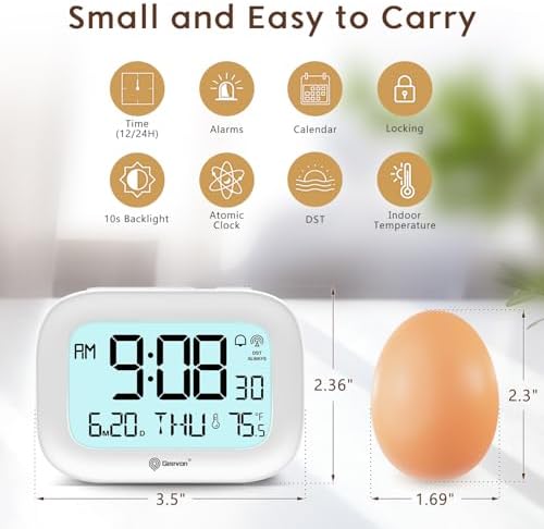 - COMPACT SIZE & TRAVEL-READY DESIGN – Measuring just 3.54” x 2.36” x 1.06”, this small alarm clock fits easily on any nightstand, desk, or shelf. The large, easy-to-read digits ensure clear visibility at a glance, while its lightweight build makes it the perfect travel companion. A convenient lock switch prevents accidental button presses during transit, making it ideal for travel, business trips, or everyday use