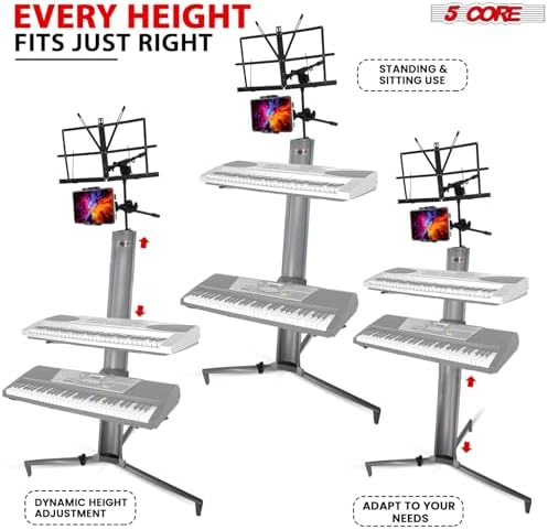 - 【Adjustable Dual-Tier Arms】Customize the height for comfortable playing, whether standing or sitting. The lower tier holds a standard keyboard, while the upper tier supports keyboards, DJ gear, or a laptop.
