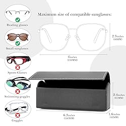 Sunglasses case is made of vegan leather with a built-in soft plush cloth to protect the lens from scratches. Large hard sunglasses cases are equipped with high-quality magnetic clasps for easy opening and closing. Portable sunglass storage organizer provides enough space for large sunglasses and can accommodate most types of glasses. Large hard shell sunglasses case dimensions: 6.3'' x 1.6'' x 2.4'' (160mm x 41mm x 61mm) Package contents: Hard sunglasses case x 1, Cleaning cloth x 1