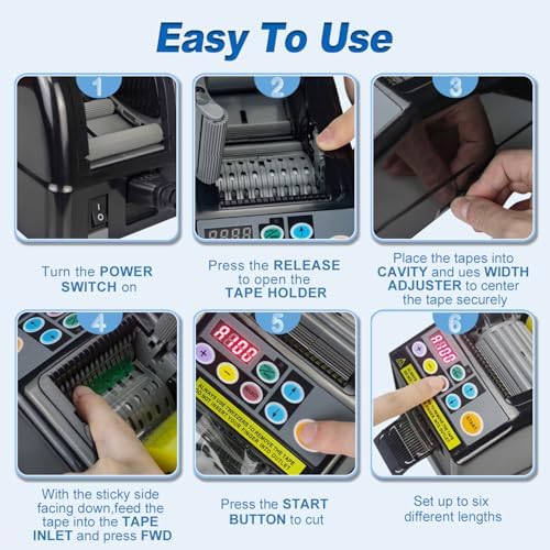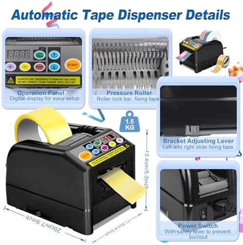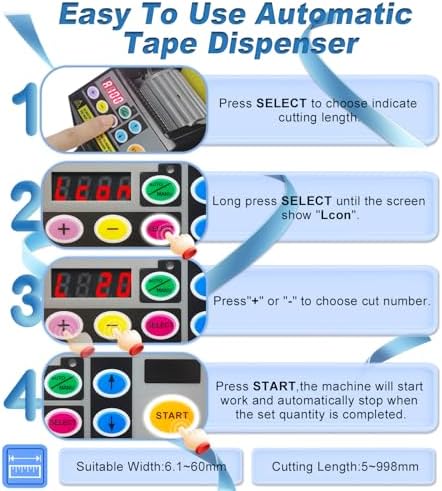 - [Intelligent Cutting] Automatic tape dispenser smart sensorcutting, cutting more precise, the cut is smoother. The automatictape dispenser can set 6 different cutting lengths and quantities.and preset cutting times. The ribbon cutter has a memoryfunction and does not need to be set again even if it is restarted.The automatic tape cutting machine can preset the maximumcutting length to 999mm. lf two rolls of tape are cut at the sametime, the sum of the width of the tape must be equal to or within60mm.