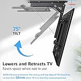 TV Compatibility: This electric flip down ceiling TV mount fits for 42-70 inch flat and curved TVs and compatible with VESA patterns 200x100mm, 200x200mm, 200x300mm, 200x400mm, 300x200mm, 300x300mm, 400x200mm, 400x300mm, 400x400mm, 500x400mm, 600x400mm or 600x500mm. NOTE: Please verify the size, weight, and VESA pattern of your TV before purchase Effortless Remote Control Adjustment: Enjoy seamless TV positioning with the powerful motor, allowing you to raise or lower your screen with ease. The included remote operates within a 98ft (30m) range, so you can adjust your TV height from anywhere in the room! Optimal Viewing Angle: The motorized flip down tv mount achieves a personalized viewing experience with a 0-75° tilt range and ±2° screen leveling. Whether you’re watching movies, sports, or gaming, you can adjust the angle for maximum comfort and immersion Space-Saving: Maximize your space by mounting your TV on the ceiling and folding it away when not in use. Ideal for both flat and sloped ceilings, this sleek solution keeps your home organized while adding a modern touch. Easy Assembly & Memory Function: Installation is a breeze with included hardware and detailed, step-by-step instructions. Plus, the remote’s memory function lets you save and recall your favorite viewing position with just a push of a button!