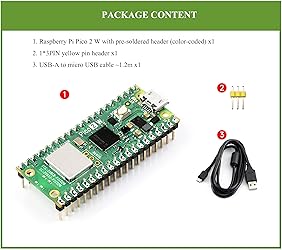 - Key features Official RP2350 microcontroller chip designed by RPi in the United Kingdom Adopts unique dual-core and dual-architecture design: dual-core Arm Cortex-M33 processor and dual-core Hazard3 RISC-V processor, flexible clock running up to 150 MHz Onboard Infineon CYW43439 wireless chip, supports WIFI 4 wireless and Bluetooth 5.2 520KB of SRAM, and 4MB of on-board Flash memory Castellated module allows soldering direct to carrier boards USB 1.1 with device and host support Low-power sleep and dormant modes Drag-and-drop programming using mass storage over USB 26 × multi-function GPIO pins 2 × SPI, 2 × I2C, 2 × UART, 3 × 12-bit ADC, 16 × controllable PWM channels Temperature sensor 12 × Programmable I/O (PIO) state machines for custom peripheral support Package Content Pi Pico 2 W with pre-soldered header (color-coded) x1 1*3PIN yellow pin header x1 USB-A to micro USB cable ~1.2m x1
