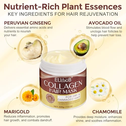 ELBBUB Collagen Hair Mask with Peruvian Ginseng, Avocado Oil, Marigold & Chamomile - Deep Repair Treatment for Dry, Damaged Hair - Restores Shine, Hydration & Strength - Suitable for All Hair Types