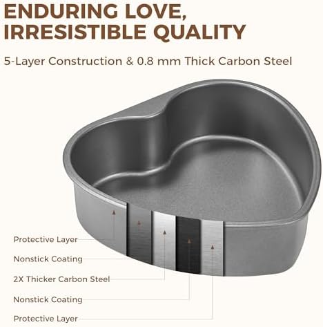 • ULTIMATE NON-STICK POWER: This small heart pan for cake, crafted with a 5-layer Whitford coating, guarantees effortless cake release every time. Free from PFOA, BPA, and PTFE, its polished surface reduces friction, ensuring your cakes retain their shape and come out clean with ease.