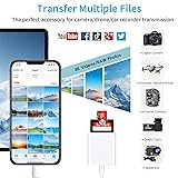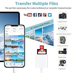 Plug and Play: This SD card reader for iPhone is easily to use, no APP, no network, no driver, no extra power. You can transfer photos from camera's SD card to your phone anytime, and share your moments with friends at the first time Two-way Transfer: The Memory Card Reader for iPhone supports two-way to stable transfer files/photos/music/video, from SD card to iphone/ipad or form iphone/ipad to memory cards. (The SD card adapter for iphone supports iOS 13 and later) High Speed Data Transfer: Digital Camera SD card reader for iPhone has a high-speed data transfer function, the SD card reader data transmission speed can reach 20MB/s~30MB/s, easily and quickly transfer videos and photos to your iPhone/iPad, saving a lot of time Capacity and Format Support: The digita camera adapter to iphone supports the memory card with a maximum capacity of 1TB. Compatible with SD/SDHC/SDXC/MicroSD/MicroSDXC/MicroSDHC cards. Support standard photo formats (including JPER and RAW) and SD/HD video formats (H.264 and MPEG-4) Universal Compatibility: The iPhone SD card reader compatible with iPhone 14/14 Plus/14 Pro/14 Pro Max/13/13 mini/13 Pro/13 Pro Max/12/12 mini/12 Pro/12 Pro Max/11/11 Pro/XS/XS Max/XR/X/8/8 Plus/7/7 Plus/6s/6s Plus/6/6 Plus/SE/SE2 and iPad Air/Mini/ Pro etc