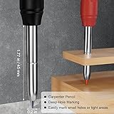 Carpenter Pencil Set: Includes 2 sturdy carpenter pencils, 26 pcs 2.8 mm refills, and 1 plastic storage box. Complete woodworking tools make it easier and faster to get the job done! Deep Hole Marker: The construction pencil has a 45 mm elongated tip design, which can reach narrow areas that other carpenter markers cannot reach for precise marking, improving woodworking efficiency and ensuring accuracy Stronger Pencil Lead: The woodworking pencil uses 2.8mm thick lead, and the writing lines are smooth and clear, and will not be easily broken or damaged, providing finer scribing and marking for drawings of construction projects Portable Design: The construction pencil comes with a built-in sharpener that easily screws onto the top of the pencil and keeps the pencil sharp and smooth; the pen clip design easily clips into your pocket for easy access Marks on Various Surfaces: Mechanical pencils can draw on metal, wood, glass, plastic, paper, plaster, tile etc. 3 colors of refills can distinguish marks with different meanings, perfect for carpenters, designers, architects, and mason