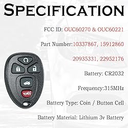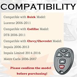 - Note: This is Aftermarket Remote Key Fob/Non-OEM, and It Doesn’t Come with LOGO or Badge. Important Note: It Doesn’t Supports Push Start Button Vehicles, It Supports Regular Key Vehicles. Compatible with Buick Model: Lucerne 2006-2011 Compatible with Cadillac Model: DTS 2006-2011 Compatible with Chevy/Chevrolet Model: Impala 2006-2013 Impala Limited 2014-2016 Monte Carlo 2006-2007 FCC ID: OUC60270 & OUC60221 Part Number:10337867, 15912860, 20935331, 22952176 Battery: CR2032 Frequency:315MHz Battery Type: Coin / Button Cell Battery Material: Lithium 3v Battery PROGRAMMING: 2010+ Vehicles Required Qualified Locksmiths or Dealership for Programming. Self-Programming Only Available for Vehicles Before 2010.
