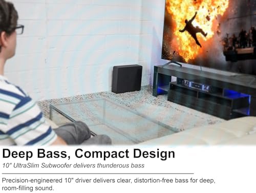 - ULTRA-SLIM DESIGN: Just 5.7" with feet (4.7" without), it fits under or behind couches or furniture-ideal for space-saving installs without sacrificing audio quality.
