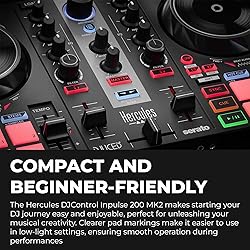 - The Hercules DJControl Inpulse 200 MK2 is a great controller for beginners to learn DJing. It includes Serato DJ Lite and DJUCED, with features like STEMS to mix vocals and music from different songs. The Beatmatch Guide helps you easily sync tracks with light indicators, and the 8 pads and 4 modes let you add fun effects and transitions. The improved pads are easier to see, and you can watch helpful video tutorials from professional DJs. It’s also compatible with Serato DJ Pro, offering more features as you improve your skills. The Gold Standard For 2-Deck Mixing Built-in audio interface with master (speakers) and monitoring (headphones) outputs Decks: 2 Play, Cue (+Sync, Shift) sections, 2 jog wheels, 2 x 4 pads with 4 modes (Hot Cue, Stems, FX, Sampler), 2 tempo faders, 2 Loop sections Mixing: 1 crossfader, 2 mixers (Gain, 2-band EQ, Filter, volume), monitoring controls, master volume Stems: Split tracks into vocal and instrumental stems Create mashups by playing a different vocal over the instrumental Mix the instrumental of the next track over the current vocal for fresh transitions Beatmatch Guide: Built-in light guides: No need to rely on a screen Tempo guide: Lights indicating where to move the tempo fader Beat Align guide: Lights indicating which direction to turn the jog wheel Austin Bazaar appreciates your purchase by adding necessary accessories. This bundle contains a case to keep your DJ controller protected and an Austin Bazaar polishing cloth to keep your instrument in mint condition.