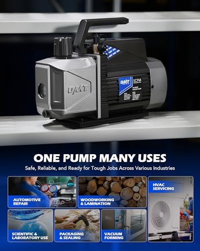 - High Pumping Efficiency: Equipped with a 3450 rpm motor, this auto ac vacuum pump delivers 5 cfm and quickly pulls down systems to 1.5 microns (0.2 Pa), making evacuations faster and helping you get the job done in less time