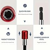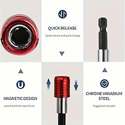 Quick Release Magnetic Bit Holders: Effortlessly secure and release drill bits with the quick-release mechanism, ensuring smooth and efficient tool operation. Strong Magnetic Head for Stability: Features a powerful magnetic head that firmly holds bits in place, preventing slippage during use for precision work. Versatile Hex Extension Bars: Includes three different lengths to accommodate various tasks, compatible with most power drills, impact drivers, and screwdrivers. Durable and Heavy-Duty Design: Made from high-quality materials, these extension bars are built to withstand frequent use and provide reliable performance in any project. Universal Compatibility for Multiple Tools: Perfect for home repairs, professional construction, and DIY projects, fitting seamlessly with a wide range of power tools and accessories.
