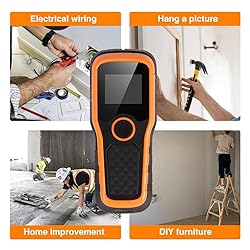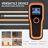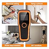 Precise and Swift: Our stud finder wall scanner is equipped with an advanced micro-sensor chip, ensuring unparalleled sensitivity for swift and accurate detection of metal, studs, joists, pipes, and live AC wires hidden behind walls, floors, and ceilings. Professionals, homeowners, and DIY enthusiasts alike will appreciate its rapid detection capability, saving valuable time and streamlining tasks effortlessly. Versatile Scanning Options: With multiple scan modes including Stud scan (0.5", 1", 1.5"), AC Scan (2''), Metal Scan (2.36'') and Non-Ferrous Metal Scan (3.15''), our stud finder offers flexibility to detect various materials and depths. The stud scan mode precisely pinpoints the center of studs, while the AC Scan mode is tailored for identifying wider objects. Additionally, the metal scan mode swiftly detects the presence of metal, providing confidence in locating plumbing behind walls. High Visibility and Comprehensive Display: Featuring a bright, backlit LCD display, our visual wall stud finder shows the center, edge and location of detected studs, along with battery status. Audio alerts and a beep sound further guide you to the exact location of the stud, ensuring ease of use even in low-light conditions. Auto Calibration & AC Wire Alert: Enjoy maximum reliability and accuracy with auto-calibration. Simply place the device flat against the wall, power it on, and hold the scan button to start calibration. Calibration is complete when you hear a reassuring BEEP sound and the screen clears. Our metal stud finder also includes an AC wire warning feature with a built-in indicator light, warning you of live wires and reducing the risk of accidental drilling for enhanced safety. Ergonomic Grip & Practical Tool: Designed for comfort and precision, our stud detector features an ergonomic anti-slip grip and high-quality plastic frame. It's a practical, dependable and user-friendly device, aiding in preventing hazards while mounting TVs, hanging photo frames, installing wall cabinets, garage racks, shelves, mirrors, bathroom fixtures and other decorations.