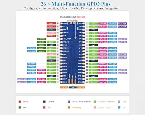 - 26 x multi-function GPIO pins. 2 x SPI, 2 x I2C, 2 x UART, 4 x 12-bit ADC, 16 x controllable PWM channels. 12 x Programmable I/O (PIO) state machines for custom peripheral support