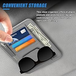 【Multi-Pocket Design】: Car storage organizer featuring a layered design with multiple pockets, there are 4 card slots, 1 side pocket, 1 pen loop and 1 sunglass holder, it keeps your small items like glasses, cards, pens, cash, invoices, driving license and coins neatly organized, ensuring everything stays within easy reach. 【Premium Quality Materials】: Made from premium PU leather, this car visor organizer bag is strong, wear-resistant, odorless, and soft to the touch, offering a luxurious feel that complements your car’s interior effortlessly. 【Universal Compatibility】: Measuring 6.02 × 4.91 inches, this car document holder fits most cars, trucks, and SUVs' sun visors. It is designed to be unobtrusive and will not block the driver's view, making it a perfect accessory for any vehicle. 【Beautifully Practical】: This multi-function mini small car sun visor organizer enhances your car's style while maintaining functionality. One-handed operation allows quick access to items, improving driving comfort without distractions. 【Simple Installation】: Equipped with a secure clip design, this car sun visor storage clip attaches effortlessly to your sun visor, staying firmly in place without affecting its normal use, and is simple to install and remove.