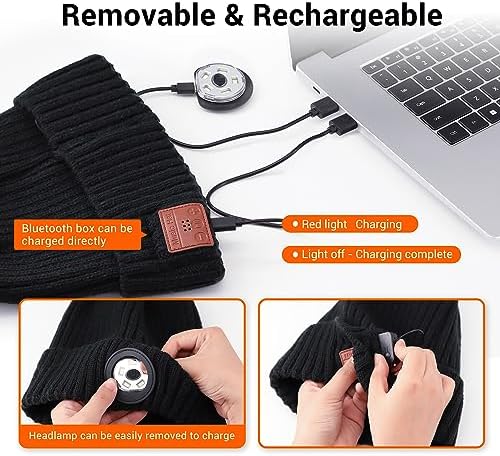 Bluetooth Beanie with Light,Music Hat with Headphones and Built in Speaker Mic,USB Rechargeable LED Headlamp Beanie,Unisex Outdoor Sport Knit Hat Black