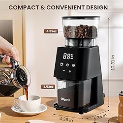 Adjustable Coffee Grinder: Ollygrin coffee grinder with 30 grinding settings, you can achieve the perfect grind for any brew method. Whether it is drip coffee, French press, cold brew, or espresso, experience the joy of personalized brewing. Clear LCD Screen: Coffee bean grinder with touch panel for easy and intuitive operation. You can select time or cups according to your daily coffee needs, with 2-12 cups and 1-60 seconds,which is convenient for all coffee lovers. Uniform Coffee Grounds:Conical burr coffee grinder with 40-millimeter stainless steel conical burr provide uniform and consistent grinding, which minimize grinding heat and protect the essential oils in the coffee bean,ensuring the richest possible flavor and aroma. Compact Design & Easy to Clean: Coffee grinder includes a cleaning brush to clean the removable upper burr, hopper and chamber, it can clean it easily for daily use. Coffee grinder in small size is an ideal choice for home and office. Safe Coffee Grinder: Electric coffee grinder is equipped with safety lock and built-in overheating protection, it could not work when it is unlocked, which can protect the motor and ensure a long life of your coffee grinder.