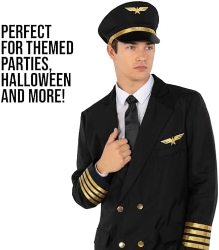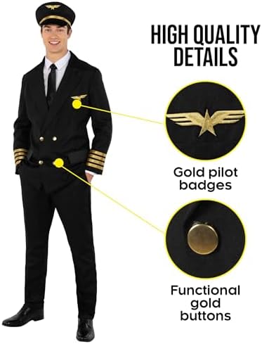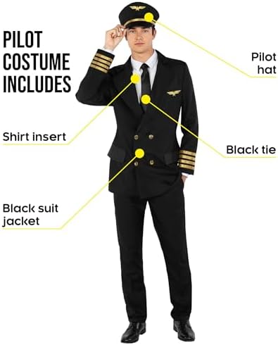 Complete Airline Pilot Costume for Men - Elevate your presence with our sleek captain’s uniform featuring a sleek black jacket, gold-accented pilot hat, shirt insert, and tie. Complete your first-class look with our adult pilot costume for men today! Multiple Sizes - We’ve got the right airline pilot costume for adult men sizes for you! Our men pilot costume comes in M, L, XL, XXL, and 3XL. It is tailored for confidence and comfort, ensuring you look your best while leading the flight. Premium Airplane Pilot Costume for Men - Crafted from non-stretch woven polyester, our flight attendant costume for men offers durability, comfort, and a crisp, tailored fit that keeps you comfortably looking like a true airline captain all the time. Over a Decade of Expert Craftsmanship - Founded in 2009 by 3 friends costume enthusiasts, we’ve grown into a global brand with 100s of high-quality designs. We have offices in the US, UK, and Europe, we ensure premium, perfect fit and standout style. Perfect Mens Airline Pilot Costume - Our stylish & realistic Halloween Pilot Costume for Men is ideally perfect for cosplay events and aspiring captains. Make an unforgettable impression with our flight pilot costume for men like never before. men fighter pilot costume, mens fighter pilot costume, air force pilot costume men, fighter pilot costume men, disfraz de piloto para hombre, airforce pilot costume for men, air force costume men, mens air force costume, disfraz piloto hombre, male pilot costume, pilot suit for men, pilot custom for men, pilot costume, pilot and stewardess costume, aviator costume adult, halloween costumes for men pilot, mens pilot halloween costume, pilot halloween costume for men, pilot mens costume, pilot outfit for men, pilot uniform for men, adult airplane costume, airplane costume adult, airforce costume men, pilot costume, pilot costumes for men, mens pilot costume, pilot coatume