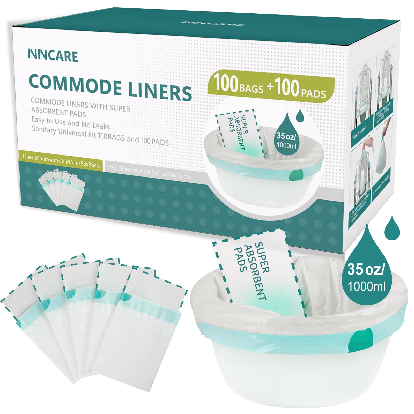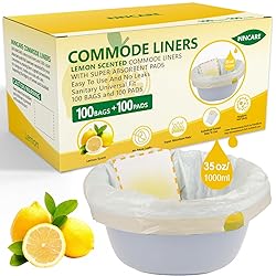 Value Pack - This set comes in a sturdy box and includes 100 commode liners and 100 super absorbent pads.These 100 commode liners disposable are much easier to get out of the box as they are individually folded instead of a roll. EASY TO USE - Simply remove the toilet seat liner with super absorbent pads by pulling the string, seal it tightly with a knot, and discard like a regular trash bag. They make cleanup a breeze! The rope can withstand a pull of 3 pounds, feel free to use it! NO MORE LEAKS AND LEMON SCENT- The ultra absorbent pads turns body fluids (up to 35 oz/1000 ml) into a gel in seconds.The potty chair liners are lemon-scented for more effective odor suppression. KEEP YOUR ENVIRONMENT TIDY - Make cleanup easy. No more scrubbing or cleaning dirty toilets, simply throw away disposable liners like a garbage bag after use to restore your dignity and prevent your caregivers or family from smelling urine in the bedroom. HYGIENIC UNIVERSAL - You don't have to worry because our liners fit all standard bedside toilets, adult potty chairs and potties. They measure 21" X 16" in and are perfect for use with portable toilets or camping toilets.