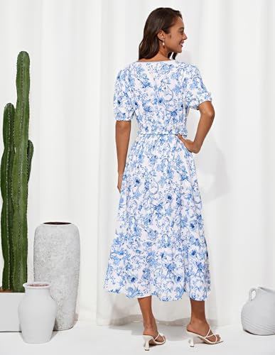 GRACE KARIN 2025 Women's Summer Floral Flowy A Line Midi Dresses Elegant Short Sleeve Smocked V-Neck Tiered Dresses