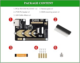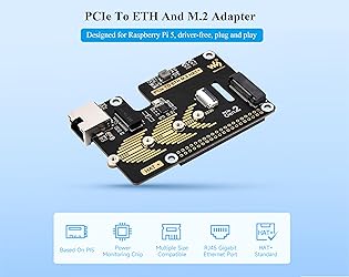 - Features PCIe to Gigabit Ethernet and M.2 adapter board is compatible with Raspberry Pi 5. Supports NVMe protocol M.2 interface hard drives, featuring high-speed read and write, and high work efficiency. NVMe Solid State Drives Support: Compatible with M.2 hard drives of 2230 / 2242 / 2260 / 2280 sizes. Supports Gen2 standard, Supports Booting PI5 From Solid State Drive. Extends 1x Gigabit Ethernet port. Equipped with RTL8111H high-performance Gigabit ETH chip, adopts sinking design of network port. Only supports PCI-E×1 Gen2 mode. Connecting to PI5 via 16PIN Cable. Based on 16PIN PCIe Interface of RPi 5. Onboard Dual LED Indicators. Easy to monitor the Working Status. Onboard Power Monitoring Chip And EEPROM. Real-time monitoring of Solid State Drive power status for More Stable operation. Onboard operational indicator lights, the PWR is continuously lit when powered on, and the ACT blinks during read and write operations, making the operational status easily visible. Network port working indicator, green light blinks if using Gigabit network port, yellow light blinks if using 100 Gigabit network port. Comes with Online Tutorial Usage Guide and Online Development Resource, Please check: n9.cl/3y8s8 Package Content PCIe TO ETH M.2 HAT+ x1 2*20 Pin header x1 16P-Cable-40mm x1 Screws pack x1 SSD mounting screw x1