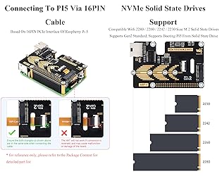 PCIe to Gigabit Ethernet and M.2 adapter board is compatible with Raspberry Pi 5. Supports NVMe protocol M.2 interface hard drives, featuring high-speed read and write, and high work efficiency. NVMe Solid State Drives Support: Compatible with M.2 hard drives of 2230 / 2242 / 2260 / 2280 sizes. Supports Gen2 standard, Supports Booting PI5 From Solid State Drive. Extends 1x Gigabit Ethernet port. Equipped with RTL8111H high-performance Gigabit ETH chip, adopts sinking design of network port. Only supports PCI-E×1 Gen2 mode. Connecting to PI5 via 16PIN Cable. Based on 16PIN PCIe Interface of RPi 5. Onboard Dual LED Indicators. Easy to monitor the Working Status. Onboard Power Monitoring Chip And EEPROM. Real-time monitoring of Solid State Drive power status for More Stable operation. Onboard operational indicator lights, the PWR is continuously lit when powered on, and the ACT blinks during read and write operations, making the operational status easily visible. Network port working indicator, green light blinks if using Gigabit network port, yellow light blinks if using 100 Gigabit network port. Comes with Online Tutorial Usage Guide and Online Development Resource, Please check: n9.cl/3y8s8
