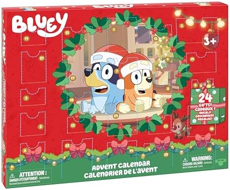 Bluey Mini Figure Christmas Advent Calendar for Kids: Bring the holiday excitement home with the Bluey Christmas advent calendar for boys and girls, the perfect way for toddlers and kids to count down the days till Christmas with daily surprises. This festive Bluey advent calendar features 24 hidden windows that open throughout December, each revealing Bluey-themed treasures, including 4 mini figures, 12 accessories, 3 paper standees, and 5 stickers, for hours of seasonal fun. Kids will love discovering Bluey, Bingo, Muffin, and Socks Bluey figures dressed in adorable Christmas sweaters and creating holiday play scenes with the included accessories and stickers. Designed for fun, imaginative play, this kids advent calendar encourages storytelling as kids decorate, mix and match pieces, and bring their favorite Bluey holiday moments to life. A delightful gift for little Bluey fans, this advent calendar for girls and boys is a wonderful way to share the joy of Christmas and create lasting family traditions filled with imaginative playtime or festive storytime fun.
