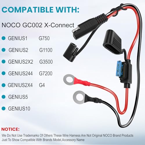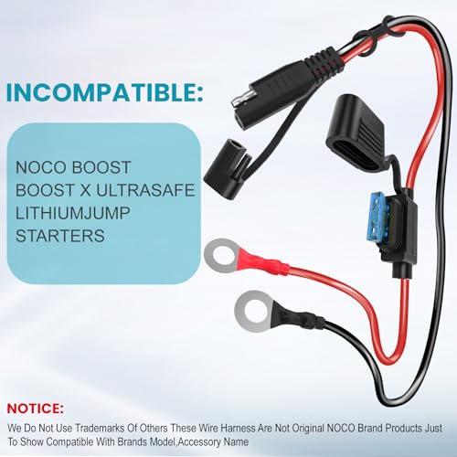 - 【Widely Compatible】SAE to O Ring Terminal Harness are specially designed to meet diversified needs, and the interface follows SAE standard specification. It's compatible with G750, G1100, G3500, G7200, and G4 models, as well as GENIUS1, GENIUS2, GENIUS2X2, GENIUS244, GENIUS5, and GENIUS10, not compatible with Boost or Boost X UltraSafe lithium starters.Which can be accurately connected with most of the devices equipped with SAE ports in the market, whether it is the battery system of electric motorcycles and electric bicycles, outdoor solar panels, energy storage devices, automotive emergency power supply, etc.