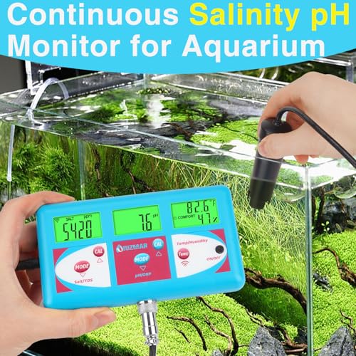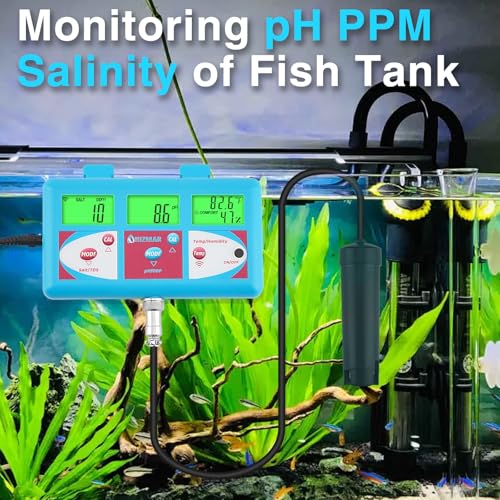 - [24/7 Continuously Monitoring Fish Tanks] This salinity monitor probe can be constantly immersed in fish tanks & koi ponds, monitoring the pH, salt, TDS, humidity, ORP and temperature continuously. Timely and accurate value can help you grasp the status of the aquarium, ensuring that you can adjust the environment in a timely manner and avoid affecting the growth of fish and plants due to environmental changes.