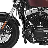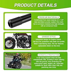 【Compatibility】Our front crash bar compatible with Harley Sportster 883/1200 2004-2022 models with forward or mid control models and works with most factory and aftermarket pipes. (Note: Front ABS brake lines and clips need to be re-routed to modify location) Please check the detailed fitment list before purchasing 【Unique style】Integrated design for engine guard, get tip-over protection with sleek low-profile west coast racing style, the crash bar features replaceable sliders on the ends. 【Versatile Protection】It can bring support when the bike unexpectedly falls, avoiding it from colliding with the ground, thus protecting the motorcycle's paint, engine, etc. Especially suitable for stunt riders when they are practicing new tricks, this flat-out bar could protect the rider and the front part of the bike well in case of an accidental fall. 【Durable Materials】Constructed from steel material of a 1.25" tube and t black powder coated, this front engine guard bar is high-strength, with an enhanced finish that ensures long-lasting protection against rust and degradation caused by exposure to the elements. 【Installation】 Our front highway engine guard crash bars come with all the necessary hardware for a quick and easy installation. The end of the crash bar is equipped with a gripper-style rubber pad, which is anti-slip and can be directly replaced. 【Package Included】1 x Front Engine Guard, 6 x Mounting Screws, 4 x Rubber Pad , 4 x Rubber Pad Screws, 6 x gaskets.