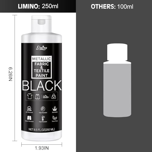 - FABRIC PAINT BLACK - Breathe new life into your favorite fabrics with our premium Black Fabric Paint! This 8.5 fl.oz (250ml) bottle lets you easily add vibrant designs, lettering, and patterns to clothing, canvas, leather, and beyond. Transform your items without changing their texture, keeping your wardrobe fresh and exciting.