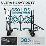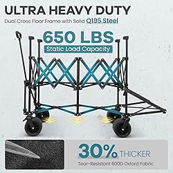 660L EXTRA LARGE DOUBLE DECKER WAGON: Maximize your outdoor storage and transportation with this XXL pull wagon. Offering a spacious 660L capacity, it's 15% wider than other double decker wagons, with an 18.5" width. Featuring an extra high extender and extended tailgate for easy loading, this wagon is perfect for camping, beach trips, and more ULTRA HEAVY DUTY SPORTS WAGON: Designed for maximum strength, this sports wagon features a 650lbs static loading capacity, perfect for transporting gear for baseball, softball, and football. The dual cross floor frame ensures better weight distribution, while the solid Q195 carbon steel frame provides exceptional support. Made with durable 600D tear-resistant Oxford fabric, this heavy-duty wagon is built to handle tough sports environments PROFESSIONAL STORAGE SYSTEM: This versatile cart features a professional storage system with side pockets for accessories and adjustable straps to secure long gear. Two large cup holders in the front are perfect for holding oversized water bottles. Ideal for camping essentials, it offers both convenience and organization for all your outdoor needs EASY TO CARRY TO ANYWHERE: This compact wagon cart is designed for ultimate convenience with a fast folding system and pull-n-wrap feature. When folded (14.6x14.6x31.8"), it’s 15% smaller than other double wagons, saving more space in your car or home. A high-quality 600D Oxford carry bag is included, making it easy to transport and store. Perfect for camping, trips, and on-the-go SMOOTH AND STABLE ON ALL-TERRAIN: Designed for all-terrain performance, this beach wagon features 7" big wheels with 4" wide rubber tires for easy navigation on sand, grass, and uneven surfaces. The 360° rotational front wheels and smooth bearings ensure effortless maneuvering, while the foot brake provides added safety and stability