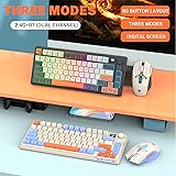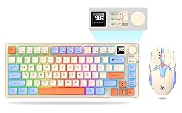 【PC Gaming Keyboard and Gaming Mouse Combo】: Includes RGB Backlit Computer Gaming Keyboard and RGB Backlit Gaming Mouse. All-in-one PC Gamer Value kit, Fantastic for Gamers. 【75% Compact Design】: Wireless gaming keyboard compact mini design, save space on the desktop, novel blue & orange&white MDA Keycap color matching, separate arrow keys, No numpad, both gaming and office, easy to carry size can be easily put into the backpack. 【Wireless Gaming Mouse】: The mouse uses high-precision optical sensor, sensitivity is 3600DPI (user adjustable 1200/1800/2400/3600 DPI), 4000fps scan rate, 125Hz tour detection rate, can withstand 10G acceleration, can meet your fast browsing and game requirements. 【Multi-Device Connection】: wireless RGB Backlit keyboard provides three connection methods, including BT5.0, 2.4GHz wireless mode, and USB wired mode. It can be connected to up to five devices at the same time, and switch between them easily by FN and key combination keys. No limits about your keyboard connection to meet the needs of work, gaming, and study. 【Rechargeable & Long Battery Life】: The keyboard is equipped with a 2000 mAh battery, and the mouse is equipped with an 500 mAh battery. The long battery life allows you to use them continuously for 8 hours with light. The keyboard and mouse are equipped with smart energy-saving functions. If there is no operation within 2 minutes, they will automatically go to sleep, press any key to wake them up. Please charge 8 hours before using. 【Plug and Play 】: The keyboard and mouse share a USB receiver, and the code has been completed by default. You only need to insert the receiver and turn on the keyboard and mouse to use it.