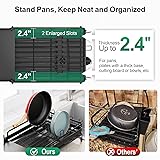 - Q: CAN THIS DISH RACK HOLD HEAVY POTS AND PANS? A: Yes, this expandable model features two dedicated 2.4 inch wide slots specifically designed to hold frying pans, cutting boards, and heavy cookware securely. Q: HOW DOES THE DRAINAGE SYSTEM WORK? A: The rack includes an integrated drainboard with a 360 degree rotatable and extendable spout. You can adjust the spout length and direction to ensure water flows directly into your sink. Q: WHAT ARE THE DIMENSIONS WHEN FULLY EXTENDED? A: The rack adjusts from a compact 16.5 inches to a maximum length of 24.4 inches. The width is 12.6 inches. Please measure your counter space to ensure a proper fit.