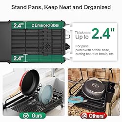 Expandable Length for Family Capacity: The adjustable design extends from 16.5 inches to 24.4 inches, capable of holding up to eleven plates, multiple bowls, and cups, ideal for large family meals or holiday gatherings Dedicated Pots and Pans Storage: This rack includes two specialized 2.4-inch wide slots designed to securely hold frying pans, cutting boards, or thick platters, making it easy to store heavy cookware alongside delicate dishes 360 Degree Auto-Drainage System: The built-in drainboard features a rotatable and retractable spout that channels water directly into the sink. The spout length can be adjusted to ensure it reaches over the sink edge, preventing water from spilling onto countertops Sturdy Rust-Resistant Construction: Made from heavy-duty metal with a protective coating to resist rust and support heavy loads without bending. It also has anti-slip silicone feet to keep it stable on the counter and prevent sliding Sturdy All-Metal Construction: Unlike dish racks with plastic extensions, this expandable dish rack features a rust-resistant all-metal frame for long-lasting durability and strength. It securely supports heavy cookware without bending, cracking, or wobbling—a reliable upgrade for everyday use