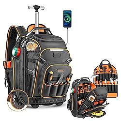 - For electricians, HVAC pros & construction workers: This heavy-duty rolling tool backpack simplifies jobsite transport. It has smooth swivel wheels for easy heavy-load maneuvering and a 41.5” adjustable trolley handle for all heights. Hidden wheel cover keeps clothes clean when using as a backpack; hidden shoulder straps stay tidy in trolley mode. The 15”L×13”W×22.5”H design with compartments organizes large tools perfectly. Made of 1680D abrasion-resistant fabric + molded hard bottom, it endures harsh work. It also has a password lock (0-0-0) for tool safety and a built-in USB port for on-the-go device charging. Full-opening layout + bright orange lining lets you find tools quickly, even in low light.