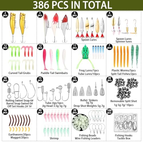 - Comprehensive Fishing Tackle Kit: this fishing tackle kit includes everything you need for a nice fishing trip, boasting 393 pieces; It comes with a fishing backpack, a tackle box, a fish hook remover tool, a fishing lip gripper, a fish weigh scale, fishing plier with sheath, lanyard for fishing plier, and various baits, such as spoon lures, lures, tube jigs and more; Packaged conveniently together, this gear ensures you're prepared for various fishing scenarios