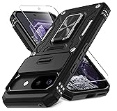 DEERLAMN Case for Google Pixel 9A with Slide Camera Cover+Screen Protector (1 Pack), Rotated Ring Kickstand Military Grade Shockproof Protective Cover-Black
