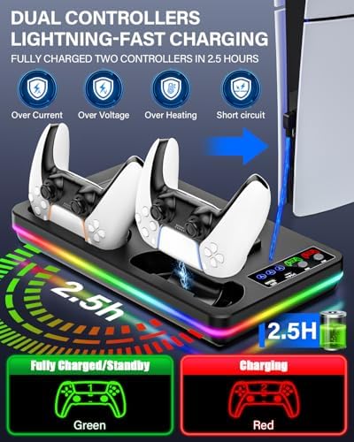 - 【2.5H Fast Charging PS5 Controller Charger & Clear LED Indicator】 The PS5 Slim stand with cooling station and PS5 controller charging station can fully charge 2 PS5 controllers at the same time in only about 2.5 hours, saving you time while charging efficiently. The Playstation 5 cooling station is equipped with a clear LED indicator light (red light: charging; green light: fully charged/standby). This Playstation 5 Slim stand has a built-in intelligent protection chip to provide overcharging, overheating, overvoltage, overcurrent and short circuit protection for the controller, which can prevent overcharging and ensure the safety of the device. (Note: Not suitable for PS5 Edge controller)