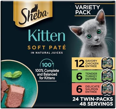 Sheba Perfect Portions Kitten Wet Cat Food Pate Chicken Entree, Salmon Entree, and Turkey Entree, 2.6 oz. Twin-Pack Trays (24 Count, 48 Servings)