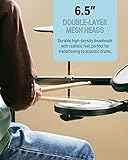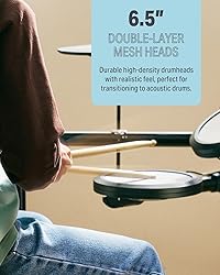 【Premium 7-Piece Drum Set】The upgraded DED-70 electronic drum set includes 4x 6.5" dual-layer quiet mesh drum heads and 3x 9" oversized silicone cymbals for authentic rebound and responsiveness, mimicking acoustic drums while keeping noise levels apartment-friendly. Also comes with enduring metal racks, drum sound module, drum throne, drumsticks, headphones. 【More Powerful Sounds Attributes】With 150 built-in sounds, 15 customizable drum kits and 10 demo songs, the DED-70 digital drum set helps beginners explore diverse styles from rock to pop. Perfect for beginners ages 6~14 eager to learn rhythm basics without overwhelming complexity. 𝐇eads up: DED drum sets requires a power amplifier for sound output. 【Silent Yet Realistic Playing Experience】Use the included headphones for immersive silent rehearsals or connect to external speakers/amps to jam with friends or perform for family. Compatible with smartphones, tablets, and music apps, the junior drum set supports play-along tracks or recording. 【Adjustable & Space-Smart Design】The ergonomic rack adapts to all young players aged 6-14 years with height-adjustable drums and cymbals, ensuring proper posture as they grow. Lightweight and collapsible frame make storage effortless. Its folded size: 24.4*10.6*35.4inch. 【Supports Portable Charger】Donner DED-70 electric drum kit is designed with two power modes - adapter or USB power bank (not included), let beginners play anywhere, making it great for outdoor practise. 【Interactive Drum Kit Lessons】40 virtual lessons from Melodics for fun and supports the Donner Play APP. Watch skills improve faster with real-time feedback, customizable drills, and progress tracking. Remember to contact customer service to receive the courses! TIPS: We do not offer subscription services of Melodics software.