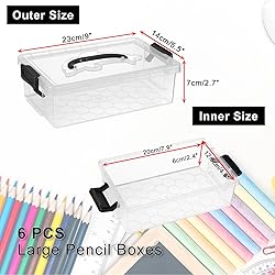 Plastic Extra Large Pencil Boxes - Exterior Dimensions: 9"L x 5.5"W x 2.7"H, Interior Dimensions: 7.9"L x 4.9"W x 2.4"H. Comes with 6 pack stackable pencil boxes with handled lid, holds lots of extra room for other accessories, such as holds 200+ pencils, 120+ pens, 100+ markers, or 300+ crayons. Stackable and Portable Dolphin Design Handle- The new upgraded embedded hidden dolphin lid with handle of the pencil case not only allows you to keep it on the go but also makes it easy to organize, save space and keep desks neat when stacked. The slim, space-efficient shape fits easily into most desks, drawers as well as backpacks and briefcase. Snap-tight Lid & Handles Keep Contents Secure- Multipurpose plastic pencil box, keep all your pencils in one place and pencil box Locking handles to keep contents secure. Clear & Sturdy Material: Constructed with quality plastic and exquisite workmanship, the pencil case organizer is super sturdy, strong and sturdy to store and protect your items for a long time. It will be around for many years to come! The transperant material allows for easy item retrieval. Widely Use: This pencil box is perfect to be used for stationary, office, travel or at home for storing coloring pencils, markers other art supplies and more. The stackable pencil box offers a great way to organize writing utensils in your craftroom or work area.