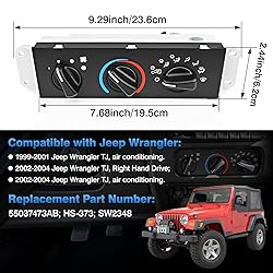 - Features: It is a great replacement for damaged HVAC control module with the appearance and function matching the original equipment on the specific vehicle. Model Match: The part number is 55037473AB;HS-373;SW2348. Please check that the code and the appearance of the part match. A match in both cases is a suitable model. Adaptability Reference: This product is compatible with Jeep Wrangler 1999-2004, Jeep TJ 1999-2004. Please check if it is suitable for your car model before purchasing. Durable Material: This Air Conditioning Control Panel is made of high quality material, which is sturdy and not easy to be damaged. Easy Installation: The product can be installed and replaced directly without breaking the wires for installation and easy operation. Specification: Part Number: 55037473AB;HS-373;SW2348 Fitment: Suitable for Jeep Wrangler 1999-2004 with Right Hand Drive; with air conditioning. Suitable for Jeep TJ 1999-2004 with air conditioning. Package Included: 1*Air Conditioning Control Panel & 1* Air Conditioning No modification required. It serves as an great replacement for your damaged AC control module.