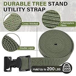 - Climbing Utility Strap with Buckle for Summit Viper Titan Tree Stand, Hunting Stand Strap Replacement Part for Holding Climbing Tree Stand and Backpack, Hanging Trail Cameras and Holding Gear, Climber Stand Seat AccessoriesWHY CHOICE US?HIGH QUALITY POLYPROPYLENE FIBERS: Tree stand utility strap are made from high quality polypropylene fibers and are double layered to hold up to 220 pounds. The interfaces utilize a criss-cross stitching technique to further enhance structural strength.HEAVY DUTY CAM BUCKLE: The cam buckle of utility straps for summit viper can conveniently and easily tie items, fasten quickly and securely. Spikes in the buckle for gripping tree stand stabilizer straps as it passes through the buckle.MULTIFUNCTIONAL STRAPS: Backpack straps for summit can not only be used to tie down hunting tools and tree stands; Hunting utility straps can also be used to link the top and bottom of a tree stand to secure the stand; climbing stabilizer straps can also be used to hang trail cameras from treesHUNTING STANDS UTILITY STRAPS INFORMATION:DIMENSION OF STRAP: 75 inch × 1 inch ( 190 cm × 2.5 cm)DIMENSION OF BUCKLE: 2.36 inch ×1.37 inch (6 cm× 3.5 cm)MATERIAL: Polypropylene Fibers, High Quality SteelSTRAP WEIGHT: 0.4 LBSWEIGHT CAPACITY: 200 LBS